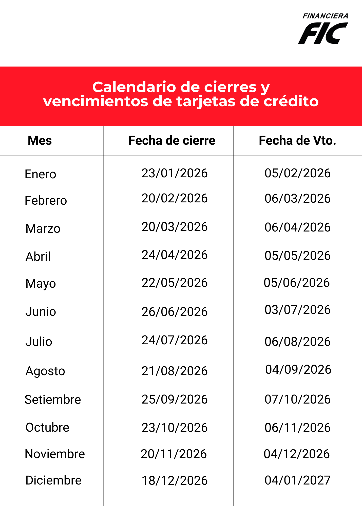 - Calendario de cierre y vencimiento de tarjetas de crédito